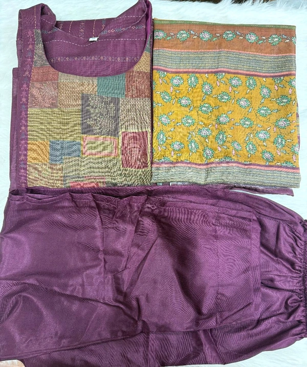 Plum/Wine Patchwork Print Kurta Set with Mustard Floral Dupatta